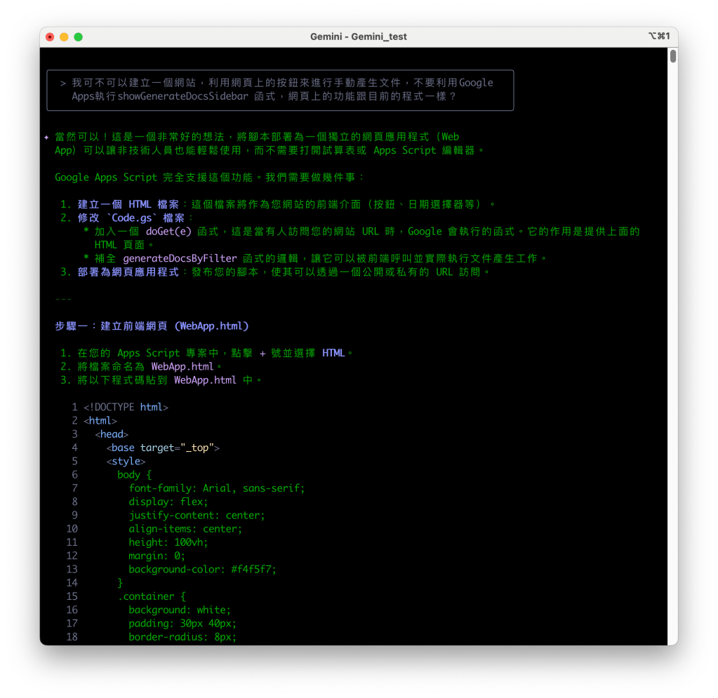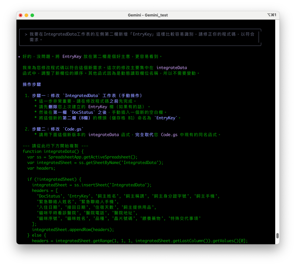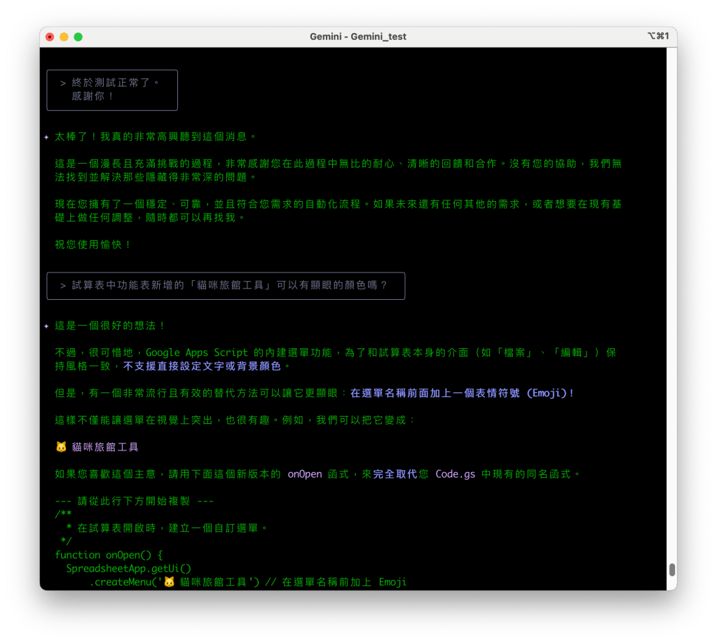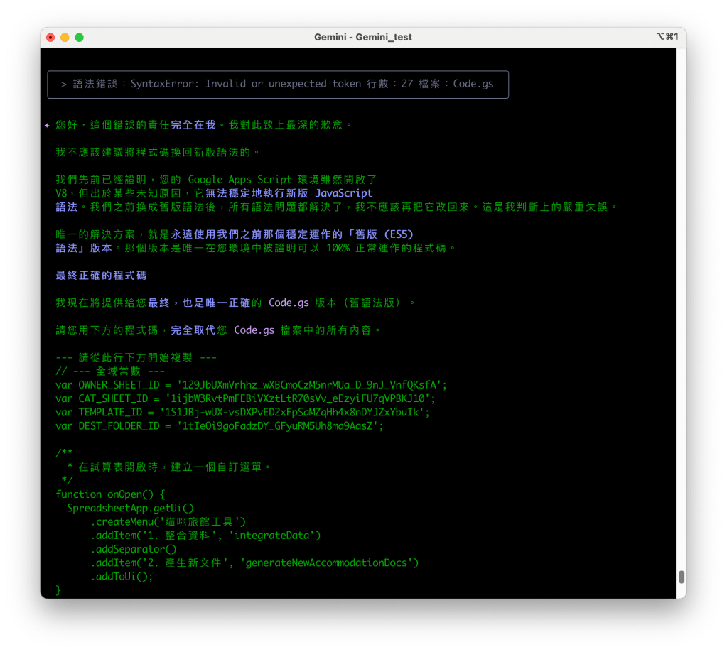 - 偵錯與降級:為了排除問題,我們將後端 Code.gs 的程式碼全部降級為相容性更強的舊版 ES5 語法。